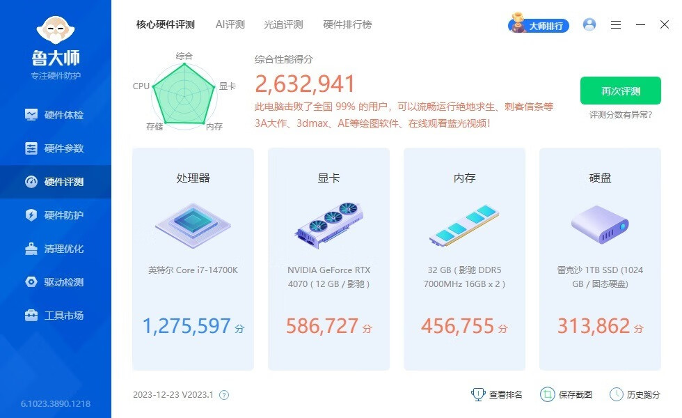 ▼簡單跑個整機(jī)測試,整機(jī)得分263.2W,處理器單獨得分127.5W,顯卡單獨得分58.6W,內(nèi)存得分45.6W,分?jǐn)?shù)都很給力。