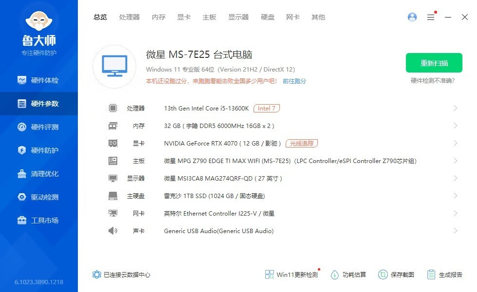 ▼整機(jī)配置一覽,處理器是13600K,主板是微星的Z790刀鋒MAX,顯卡是影馳的RTX4070 20周年紀(jì)念版。