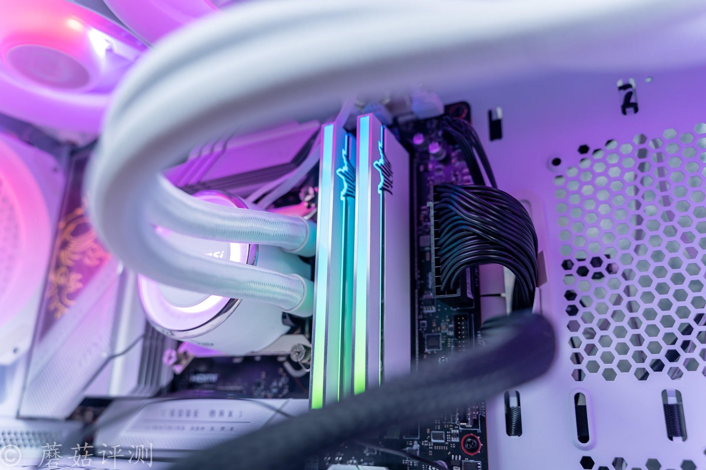 ▼內(nèi)存用的是影馳的HOF PRO 16GB*2 7000MHz DDR5內(nèi)存,這套內(nèi)存的顏值很漂亮,頂部和側(cè)面都有漂亮的ARGB燈帶。另外這套內(nèi)存的超頻潛力很給力,7600MHz、甚至是8000MHz都可以很輕松的上去。