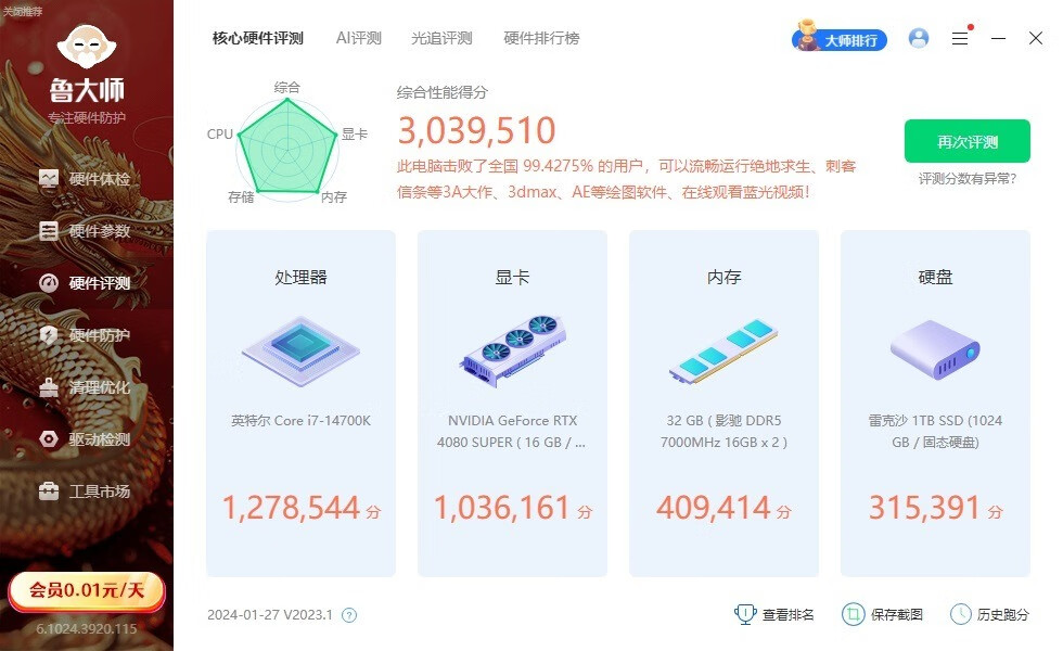 ▼整機配置一覽,處理器是14700K,主板是微星的Z790刀鋒MAX,顯卡是影馳的RTX4080 Super星曜OC,整機配置很強。