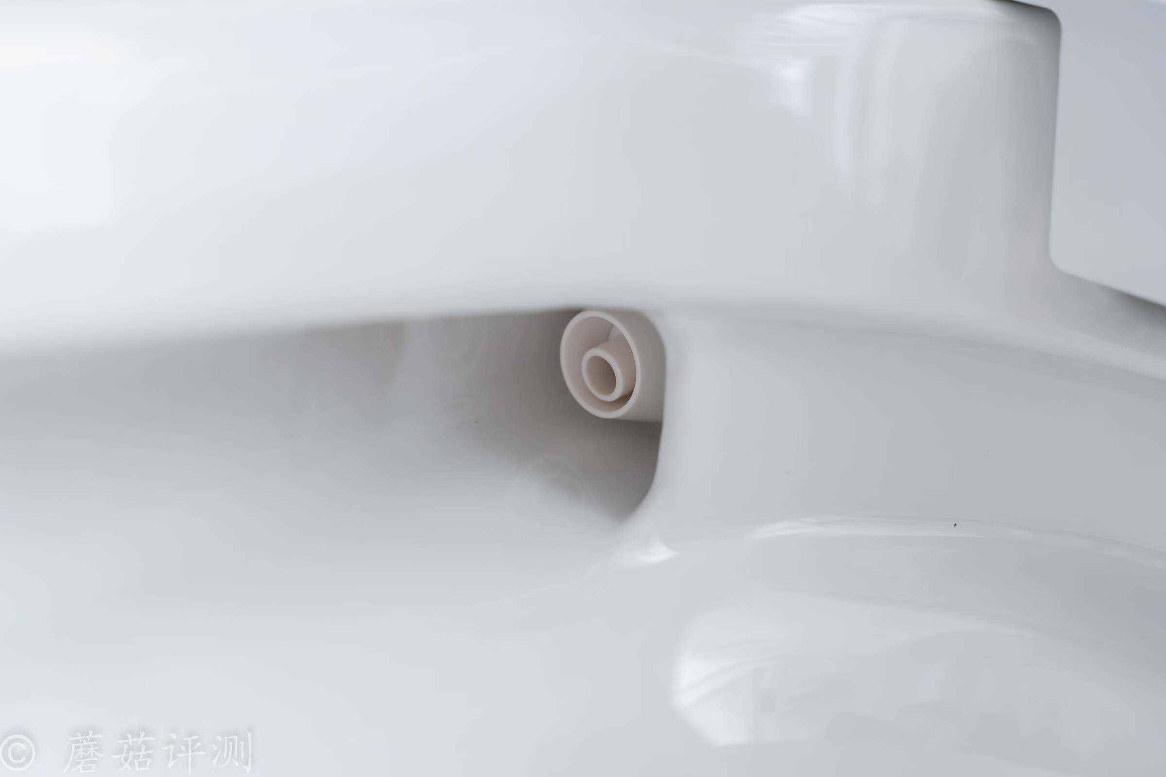 ▼馬桶上部水道的出水口,有角度設計的,不是直出的,老款的Qe5是直出的。出水的角度,搭配漸變的弧度階梯,可以輕松靠著較少的水量,充分潤濕馬桶側面。
