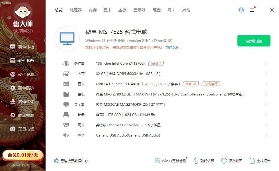▼整機配置一覽,處理器是13700K,主板是微星的Z790 EDGE Ti MAX,顯卡是索泰的RTX4070 Ti Super OC月白。