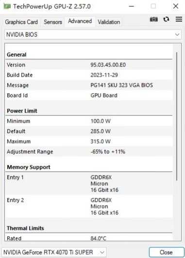 ▼簡單看下顯卡的BIOS,默認功耗給到了285W,最大功耗可以去到315W。