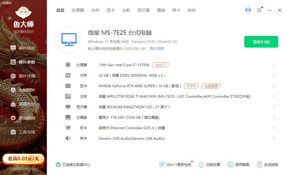 ▼整機配置一覽,處理器是13700K,顯卡是RTX4080 Super,整機配置很不錯。