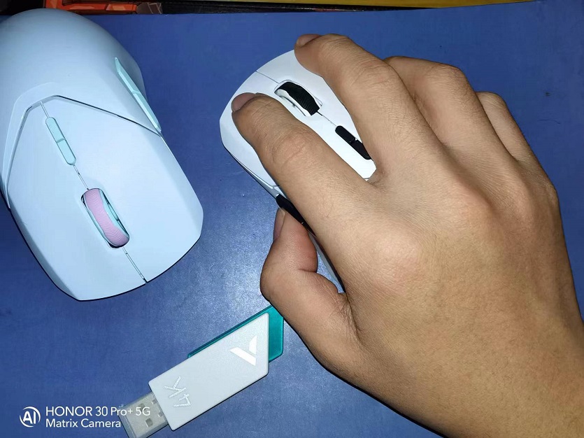 雷柏VT9Pro外觀相對于之前的VT9和VT9s僅僅多了兩個DPI鍵,鼠標的最高處仍然是偏向于中后位置,所以比較適合抓握和趴握。對稱的造型、獨立式左右主鍵設計,符合右手人體工學設計在使用的過程中受力更均勻,游戲瞄準時更容易、更精確,帶來了更加靈活的操作體驗。鼠標中線刻度感要更強一些,因此它的觸發力度更大一些,按一下的感覺,其實更輕一些。